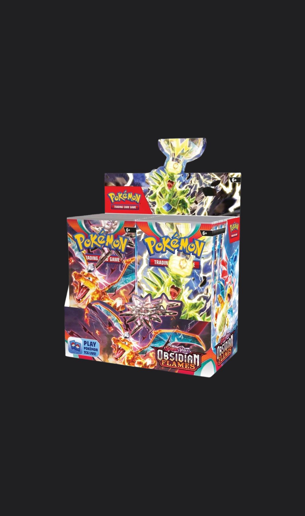 Darkness crackles through the night as glowing embers light the sky—Charizard ex emerges with a fierce new edge, empowered by shadowy strength! The dazzling Terastal phenomenon transforms select Pokémon ex like Tyranitar, Eiscue, and Vespiquen, granting them unexpected types and fresh tactical potential. Meanwhile, Dragonite ex and Greedent ex tap into their inner power, and heavy hitters like Revavroom ex and Melmetal ex stand ready to reshape the battlefield in Scarlet & Violet—Obsidian Flames.