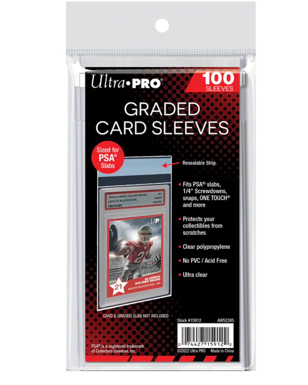 Ultra-clear, archival-quality sleeves designed for PSA® graded slabs provide reliable protection for both the graded card and its holder. These sleeves help keep slabs clean while shielding them from scratches and surface wear. A convenient resealable strip allows for easy insertion and removal. Each pack contains 100 sleeves.